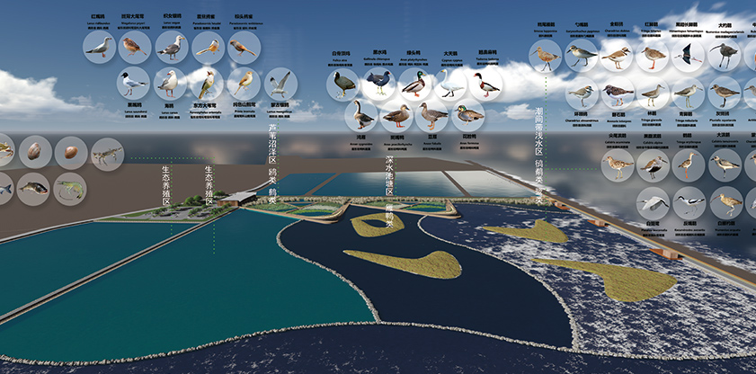 LOVE棲息地在潮間淺水區(qū)和深水區(qū)設(shè)計(jì)人工島棲息地,即水鳥(niǎo)高潮棲息地,棲息地通過(guò)不同水生池塘分為候鳥(niǎo)區(qū)和流鳥(niǎo)區(qū),可容納恒魚(yú)類(lèi)、鴨類(lèi)、鷺類(lèi)水鳥(niǎo),保證全天候的觀鳥(niǎo)體驗(yàn)。