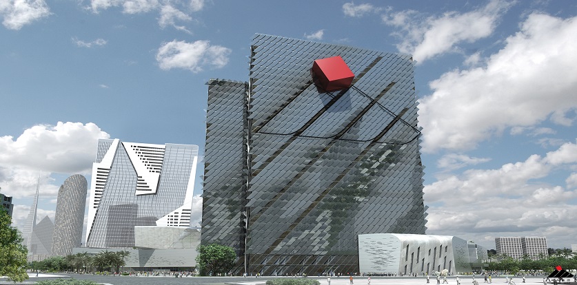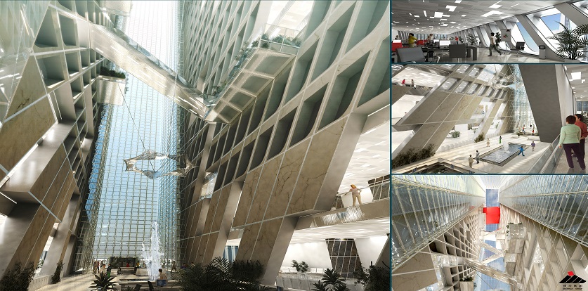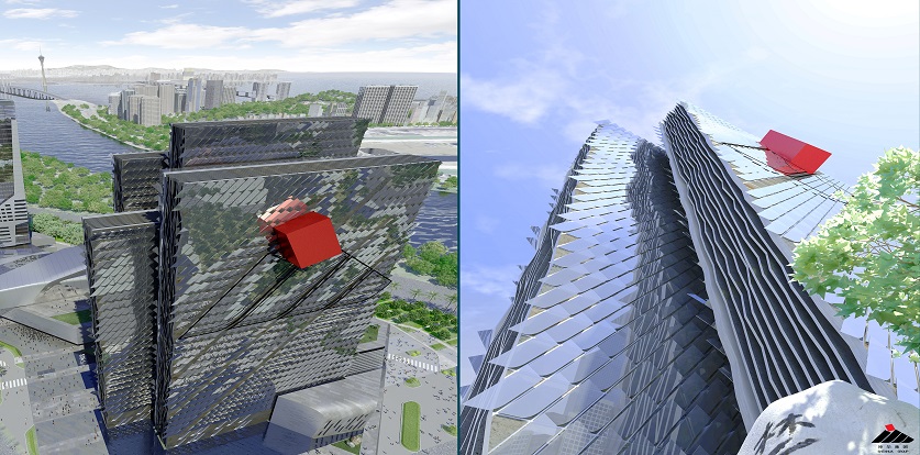 設(shè)計手法:配合該區(qū)域經(jīng)濟(jì)發(fā)展情況,在短期內(nèi)還需要建設(shè)高質(zhì)量的建筑物。成為城市性標(biāo)志建筑。新總部形象需與自然融為一體,并與周圍的自然元素銜接,且在某種情況下可形成一面“鏡子”,通過一種特殊形式反射出這些形象:反射出天空的藍(lán),反射出公園的綠、反射出海水的藍(lán)。設(shè)計了波浪狀的垂直立面,是考慮波動的立面可反射出更加逼真的形象。同時對總部辦公樓進(jìn)行體量調(diào)整:整體形象為四個垂直棱柱,分別象征著神華集團(tuán)里四所不同行業(yè)的公司。此設(shè)計理念主要基于神華集團(tuán)的組織結(jié)構(gòu)分布,外立面上醒目的集團(tuán)標(biāo)識也再次闡述了建筑的寓意。紅色的棱形柱,橫架于四個建筑物中,象征著燃燒的煤炭。該設(shè)計手法加強(qiáng)了對標(biāo)志概念性的解讀。對于酒店,設(shè)計過程中不引入象征性元素。是基于其本身別具匠心的形象,該形象符合商業(yè)廣告的標(biāo)準(zhǔn),設(shè)計過程引入了宏觀穿孔材料,以打造高水準(zhǔn)客房。特殊的宏觀穿孔材料可“適應(yīng)”窗口角度,不斷調(diào)整以指向天空,產(chǎn)生出兩種不同形象的效果,一種是為順應(yīng)商業(yè)的標(biāo)準(zhǔn),而另外一種則體現(xiàn)出其自然屬性。兩座塔樓,一座是總部辦公和及其基礎(chǔ)設(shè)施用房,另外一座是酒店,位于同一群樓的二者功能分布其中,視覺上又形成整體效果,打造出一個綜合體。會議中心設(shè)置在群樓上方,該設(shè)計理念則是源于一種自然設(shè)計的手法。總部的塔樓和酒店均為南北朝向,并合理地運(yùn)用錯層式設(shè)計,使其坐看珠江和澳門海灣美景。
