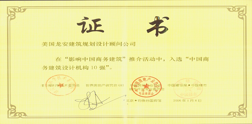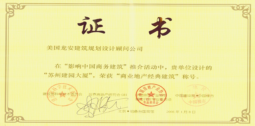 獲獎(jiǎng)情況:2006年,中國(guó)建設(shè)報(bào)中國(guó)樓市主辦“影響中國(guó)商務(wù)建筑”推介活動(dòng),榮獲“商業(yè)地產(chǎn)經(jīng)典建筑”稱(chēng)號(hào);美國(guó)龍安公司榮獲“中國(guó)商務(wù)建筑設(shè)計(jì)機(jī)構(gòu)10強(qiáng)”,饒及人先生榮獲影響中國(guó)十大公建設(shè)計(jì)師稱(chēng)號(hào)。