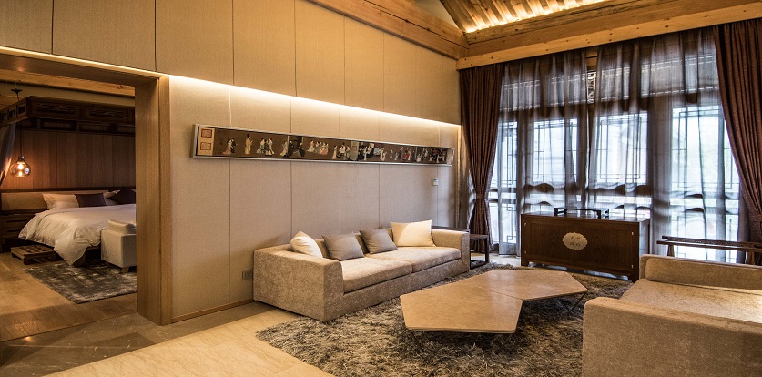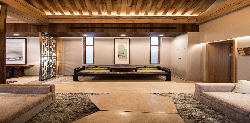 項目結(jié)合了中西方傳統(tǒng)和現(xiàn)代藝術(shù)。起居室的靈感源于幽靜的山脈,既有中式家具的運用,又不乏現(xiàn)代感。
